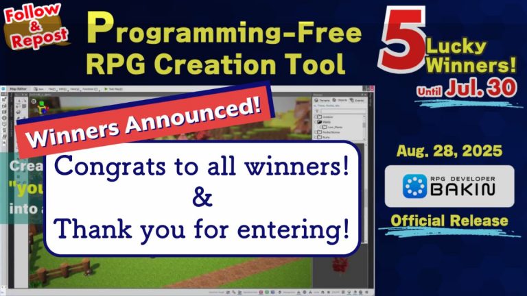 Starting today, to celebrate the upcoming official release of RPG Developer Bakin on August 28, 2025, we’re launching a Follow & Repost campaign across our official social media channels.