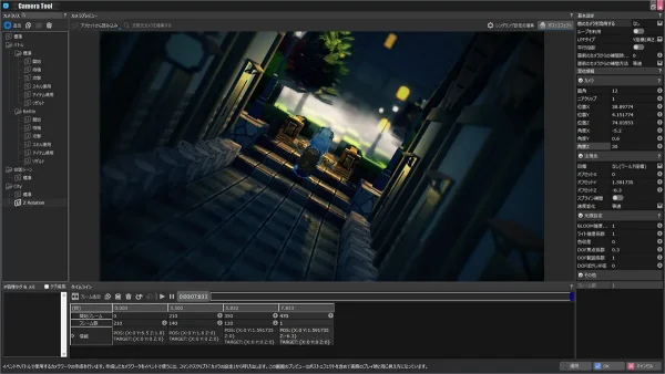 カメラのZ回転(ロール)機能を実装しました。画面をあえて傾けることで不安感を演出するホラーシーンや、プレイヤーに強い印象を与えるカットシーンなど、より印象的な映像演出が可能になります。