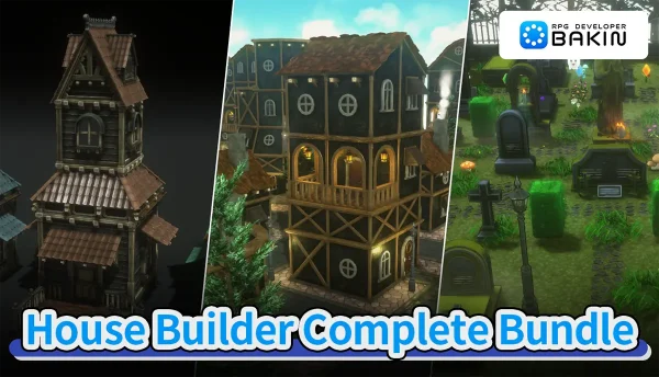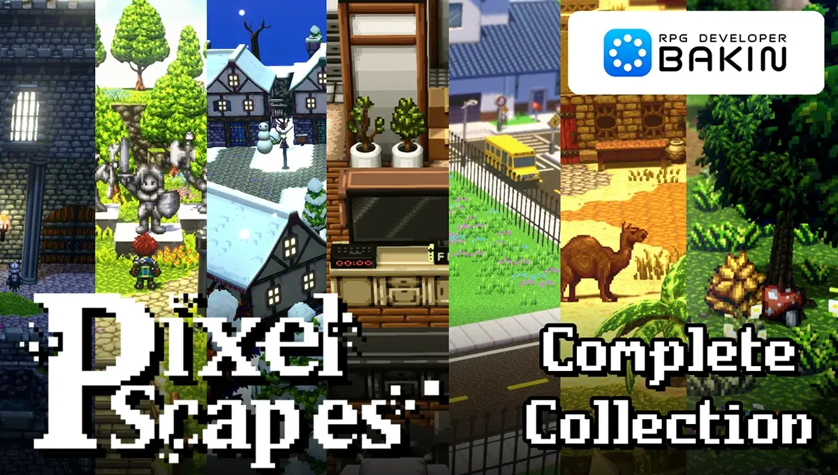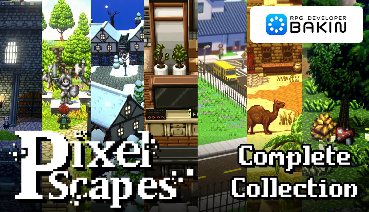 本日、ツール本体に加え、人気のピクセルアート風3Dモデルパック「PixelScapes」シリーズの7タイトルをすべて収録した『RPG Developer Bakin PixelScapes Complete Collection』と、ツール本体と建築系DLC9タイトルをまとめて収録し、家屋や街並み、砦や墓地まで自在に制作できる『RPG Developer Bakin House Builder Complete Bundle』の販売を開始しました。