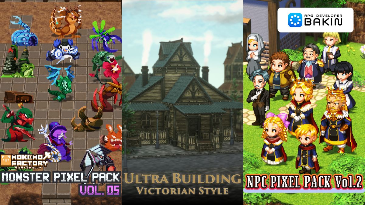 クラシックなビクトリア様式の街並みを構築できる3Dモデルパック『Ultra Building Victorian Style』、個性豊かなバトル用モンスターのドット絵素材集『Mokemo Factory MONSTER PIXEL PACK Vol.5』、標準素材のサポートキャラクターを高解像度で再構築したドット絵キャラクター素材集『Vibrato NPC PIXEL PACK Vol.2』が登場です。