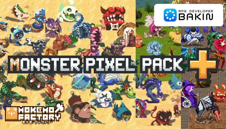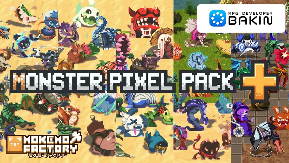 本日、ツール本体に加え、人気のDLC『Mokemo Factory MONSTER PIXEL PACK』のVol.1〜5をすべて収録した豪華バンドル版『RPG Developer Bakin MONSTER PIXEL PACK+』の販売を開始しました。