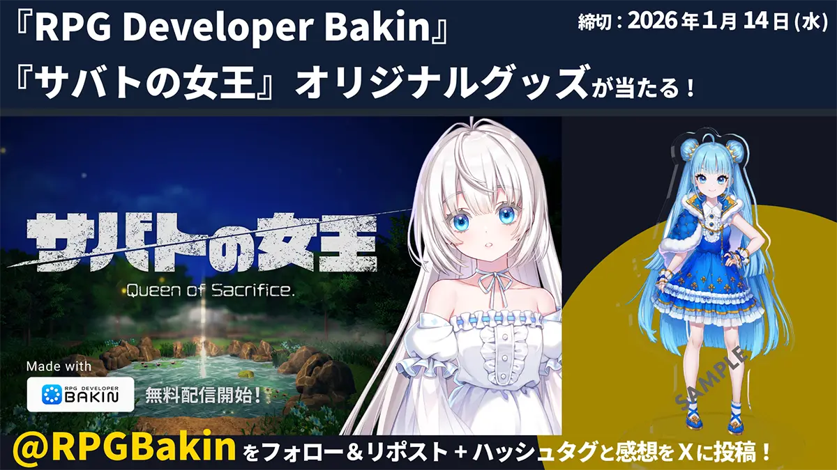 Bakinの公式Xアカウントをフォローして、キャンペーンの投稿をリポストすると、抽選で3名様に『RPG Developer Bakin』をプレゼントします。さらに、感想やスクリーンショットなどを2つのハッシュタグをつけてXに投稿すると、抽選で10名様に『RPG Developer Bakin』と『サバトの女王 Queen of Sacrifice.』オリジナルグッズをプレゼントいたします。