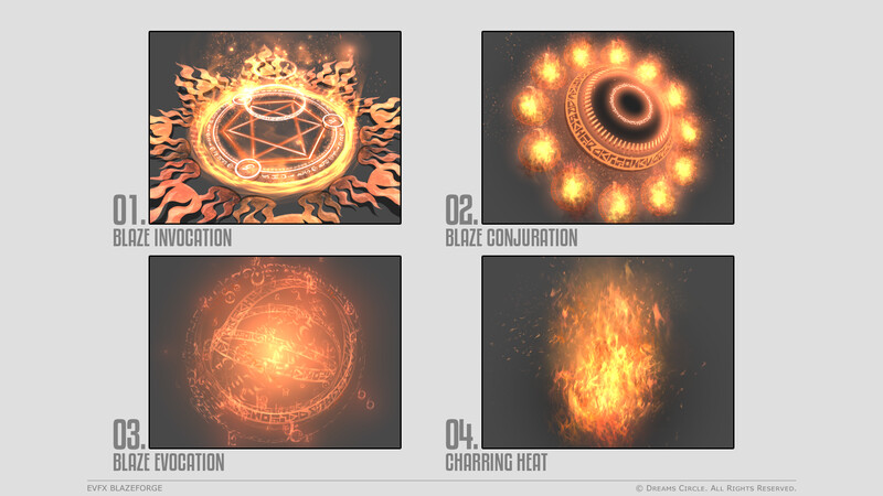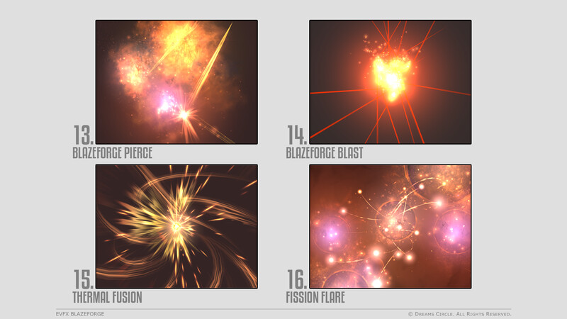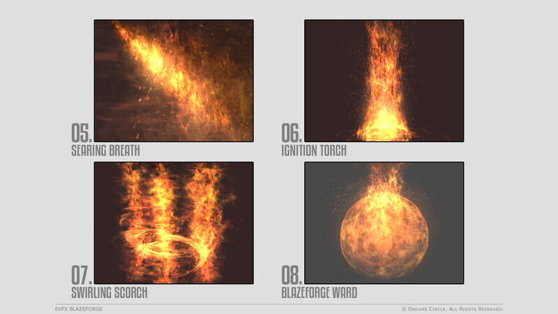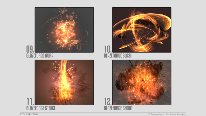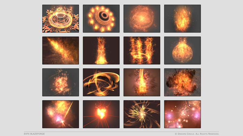 高品質なゲームアセット制作を専門とするチーム Dreams Circle によってデザインされた 『EVFX Blazeforge』 は、16種類の美麗なビジュアルエフェクトとそれらに対応する効果音を収録したエフェクトパックです。