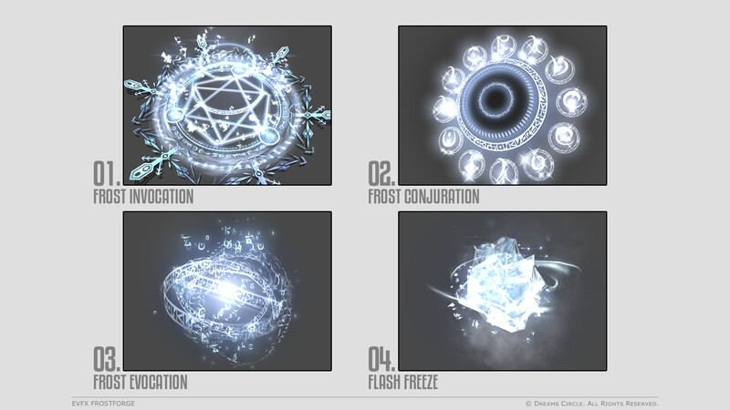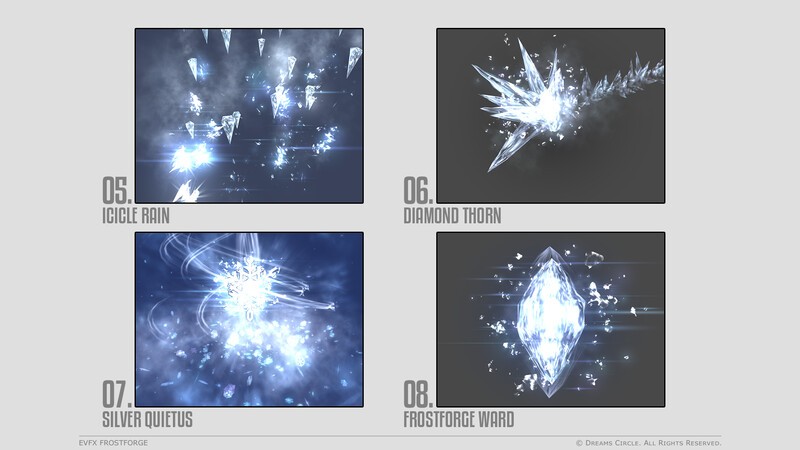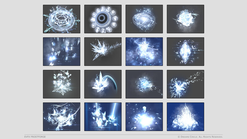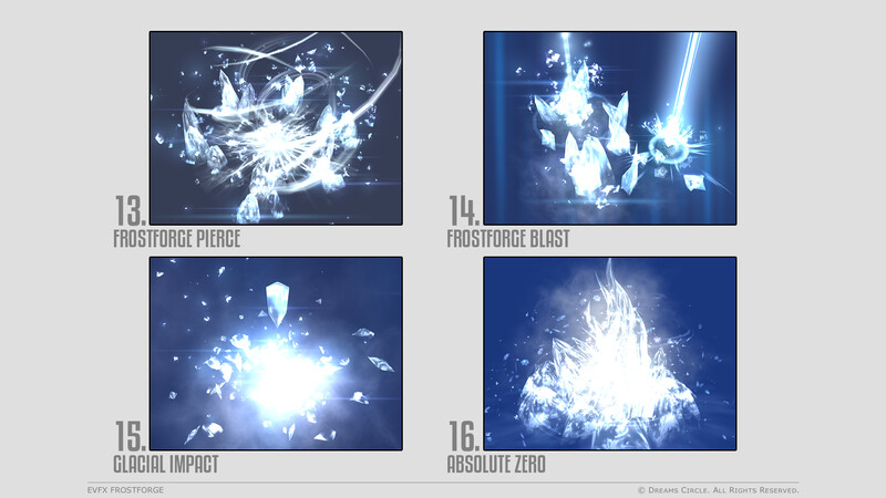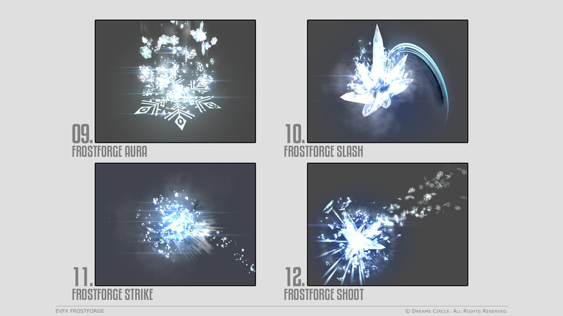 高品質なゲームアセット制作を専門とするチーム Dreams Circle によってデザインされた 「EVFX Frostforge」 は、16種類の美麗なビジュアルエフェクトとそれらに対応する効果音を収録したエフェクトパックです。