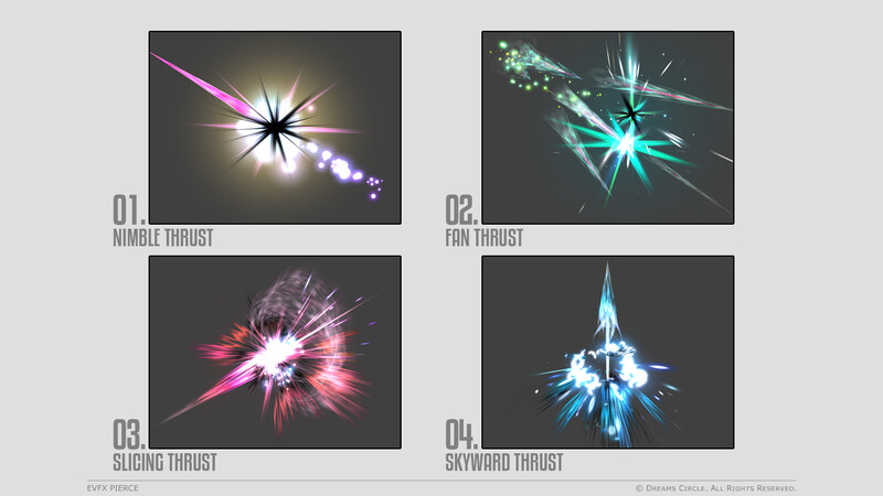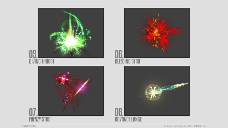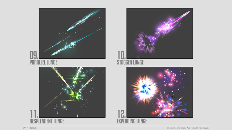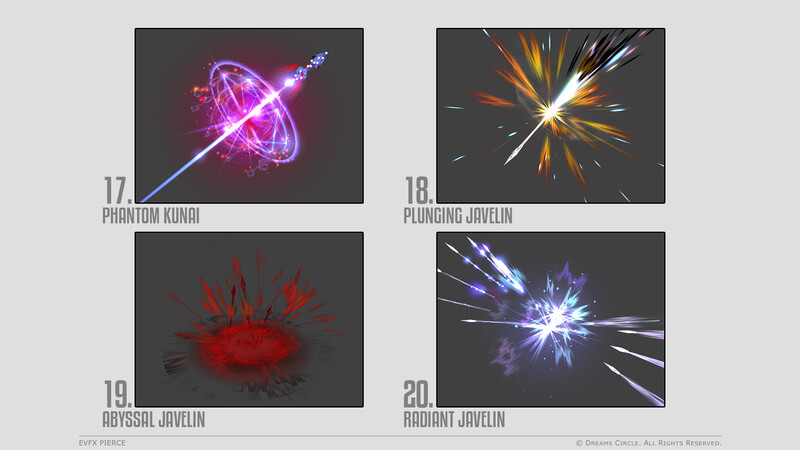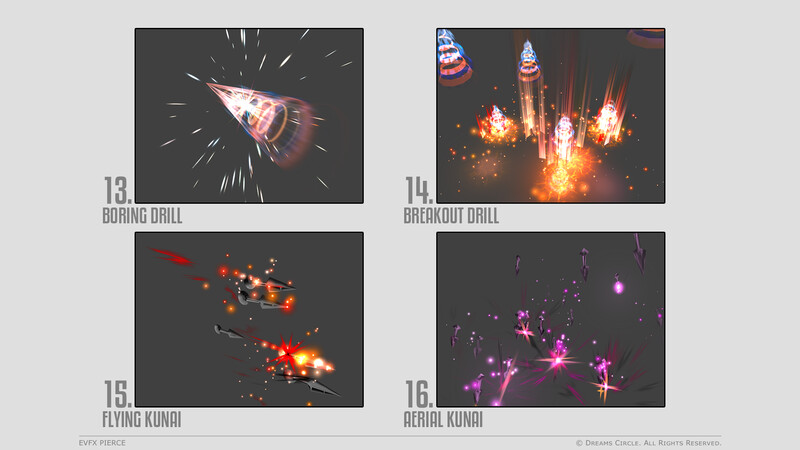 高品質なゲームアセット制作を専門とするチーム Dreams Circle によってデザインされた 「EVFX Pierce」 は、20種類の美麗なビジュアルエフェクトとそれらに対応する効果音を収録したエフェクトパックです。