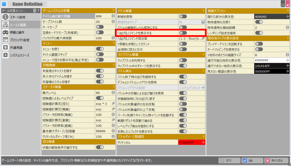 - この例では個々のメンバーのバトルコマンドから「逃げる」を外してみます。