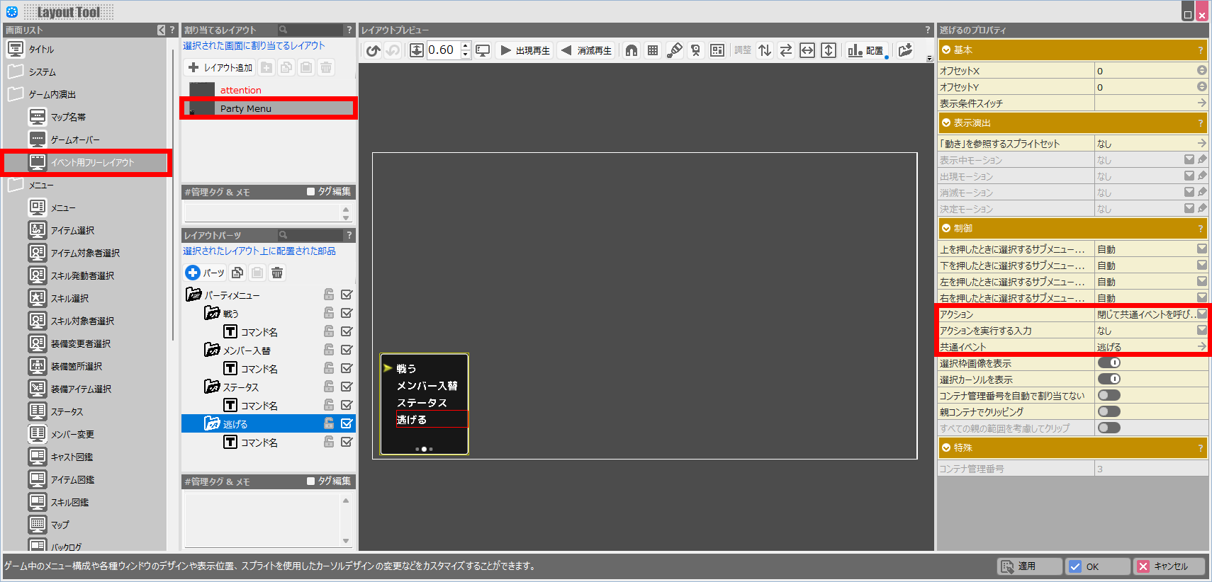 呼び出すメンバー交代画面のレイアウトは、表示した時にパーティメニューと被らないようにレイアウトツールで調整しておきましょう。