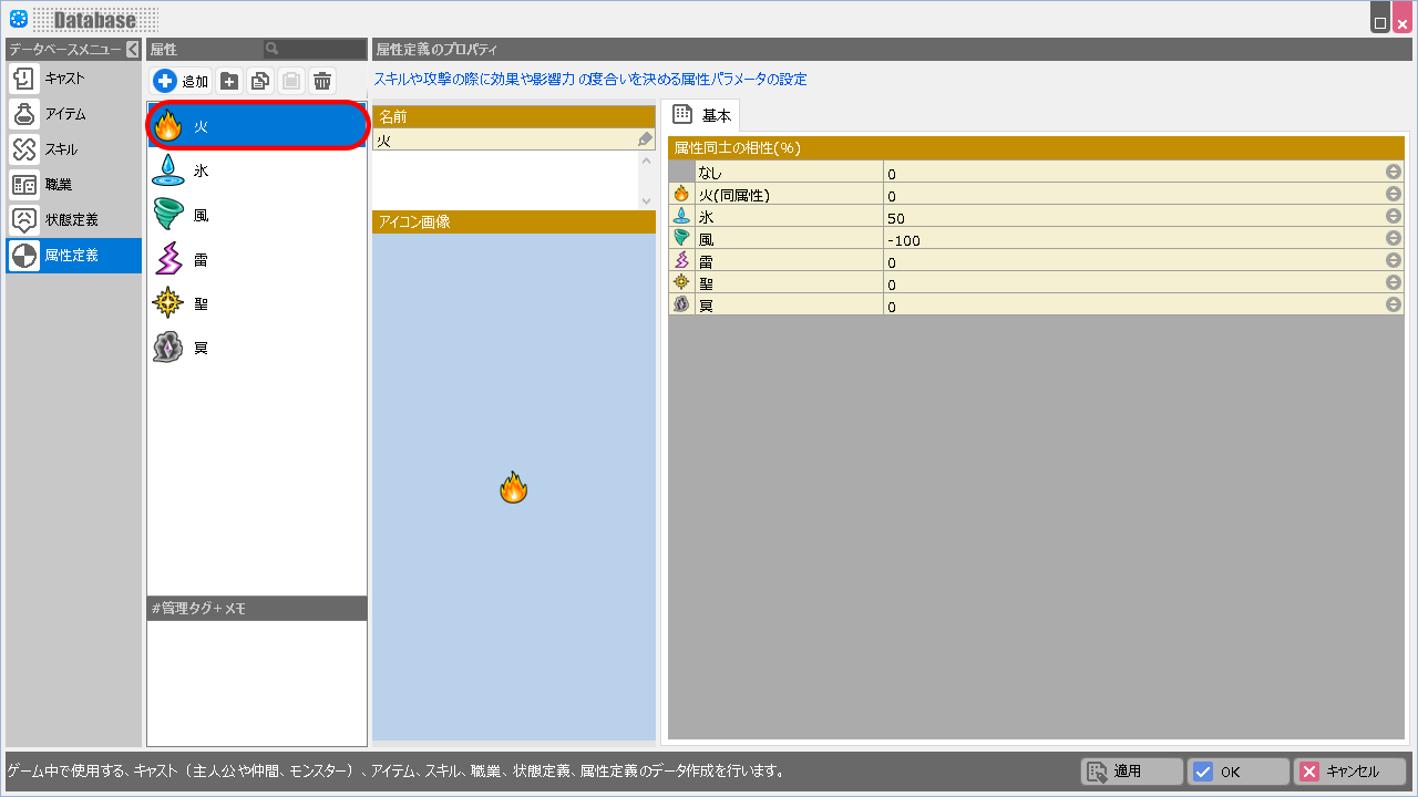 属性の相性についてはデータベースの「属性定義」で設定できます。
