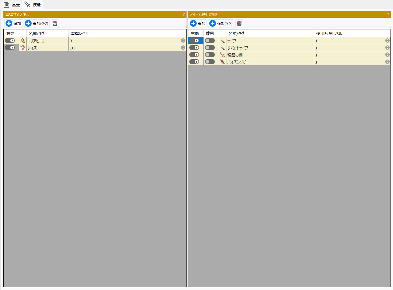 追加ボタンを押してスキルを選択し、習得するレベルを設定します。