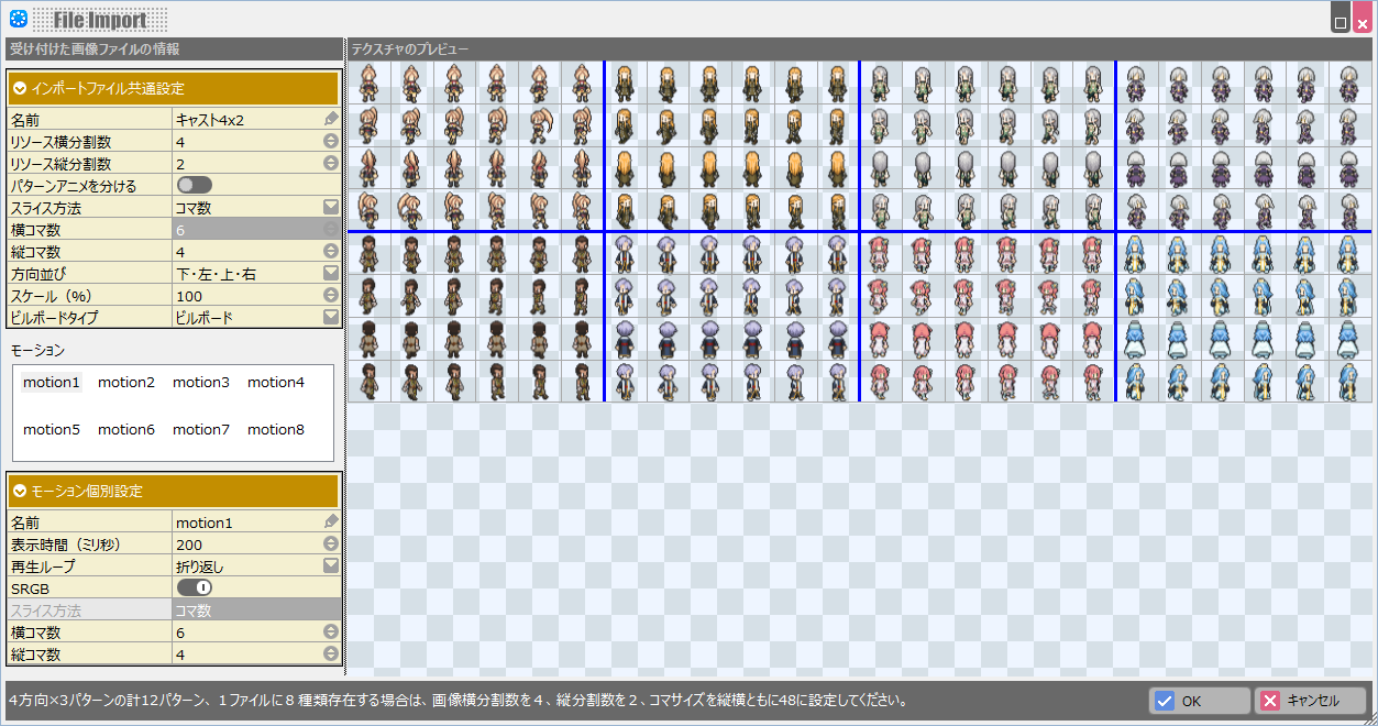 画像の向きがどの順番で並んでいるかを指定することで、Bakin用の並びに画像を自動変換して取り込みます。