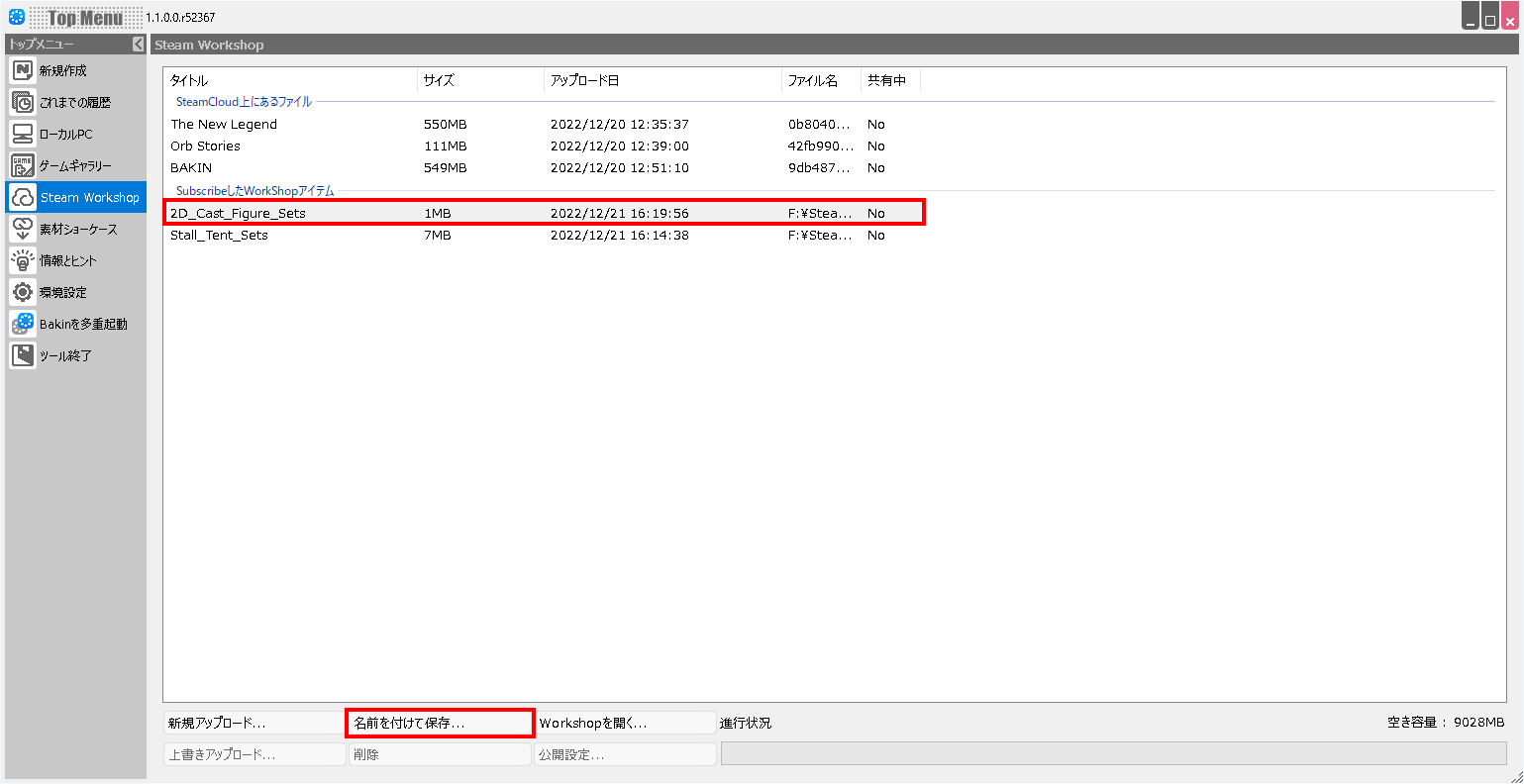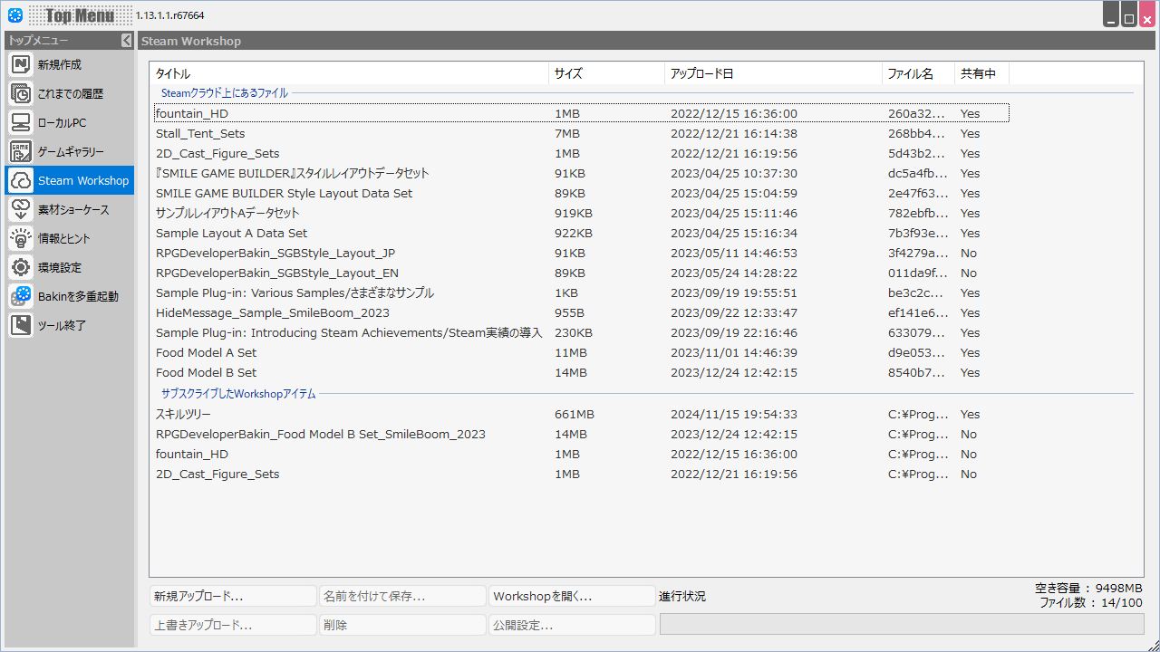アップロードおよびサブスクライブ中のコンテンツタイトル、データサイズ、アップロード日、ファイル名、Steam Workshp上での公開状態を表示します。