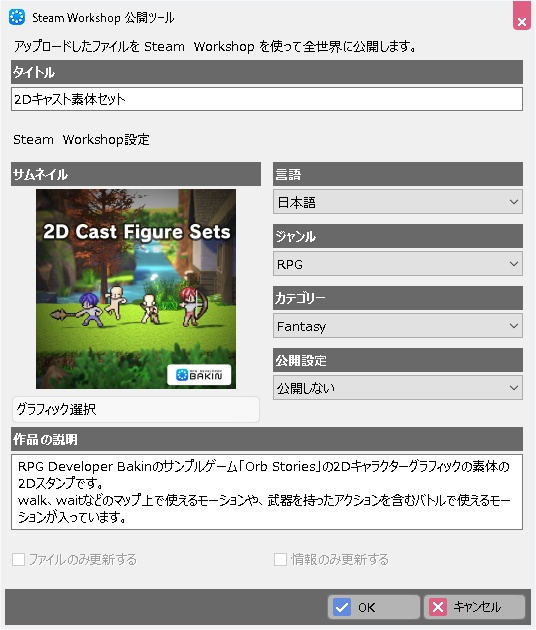 (!)Steam Workshopをサブスクライブされる側(ご利用される側)は、当該データのSteam Workshopページの更新日時と、BakinのSteam Workshopダイアログの「Subscribeされたファイル」の日時が合っているかをご確認ください。