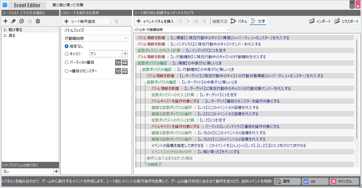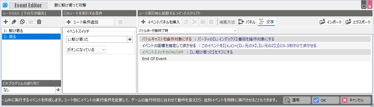 - まずコモンイベントパレットでバトルイベントを新規で作成し、「駆け寄る」「戻る」という2つのイベントシートを作ります。