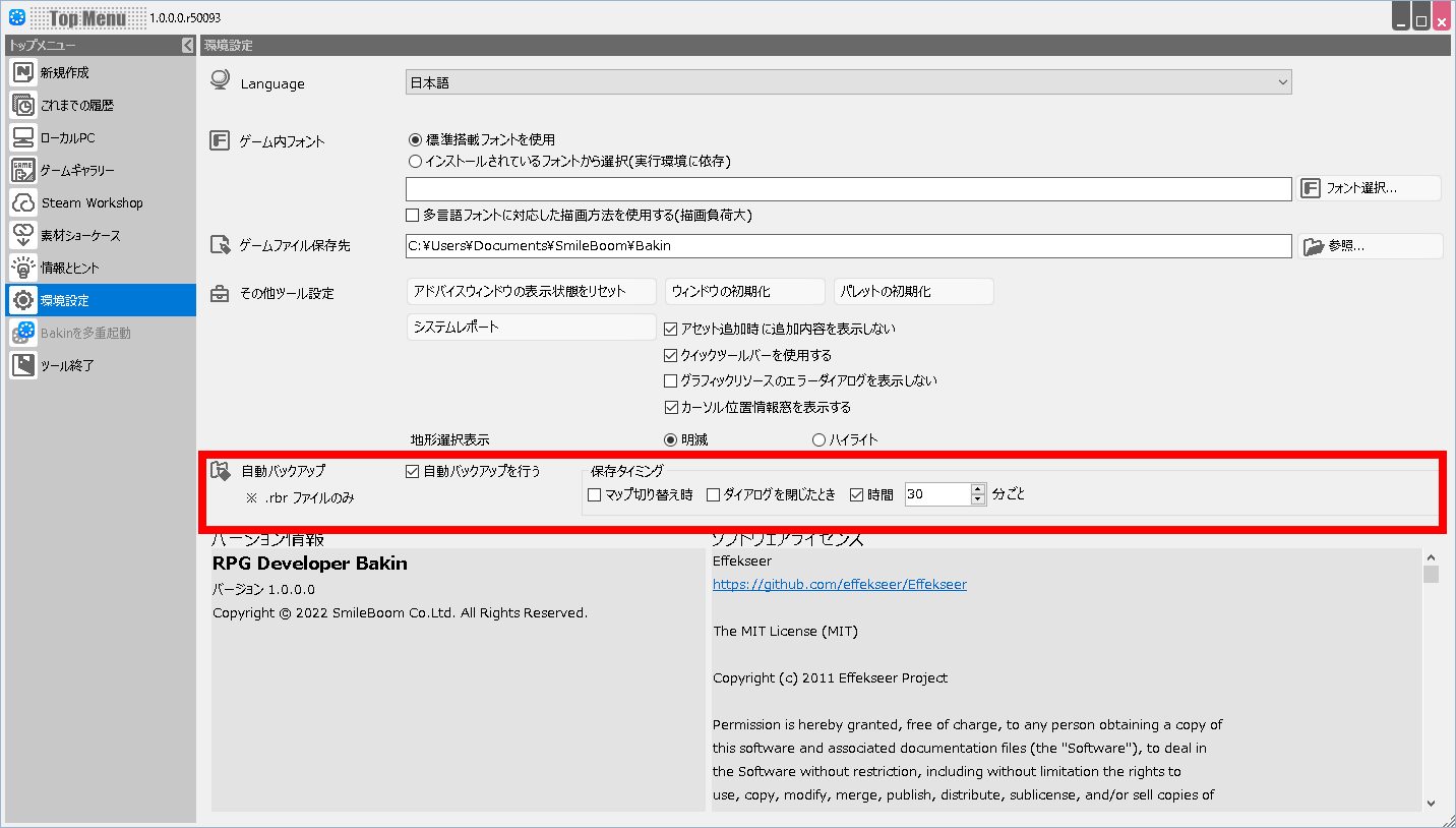 『RPG Developer Bakin』を起動後のトップメニューにある「環境設定」メニュー内で、作成中のゲームのバックアップタイミングについての設定ができます。