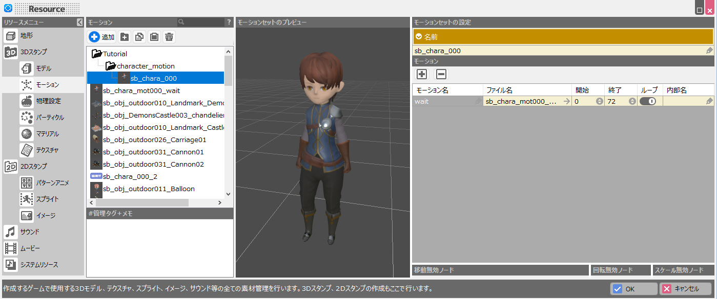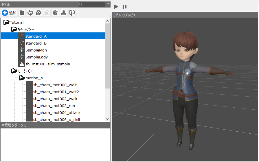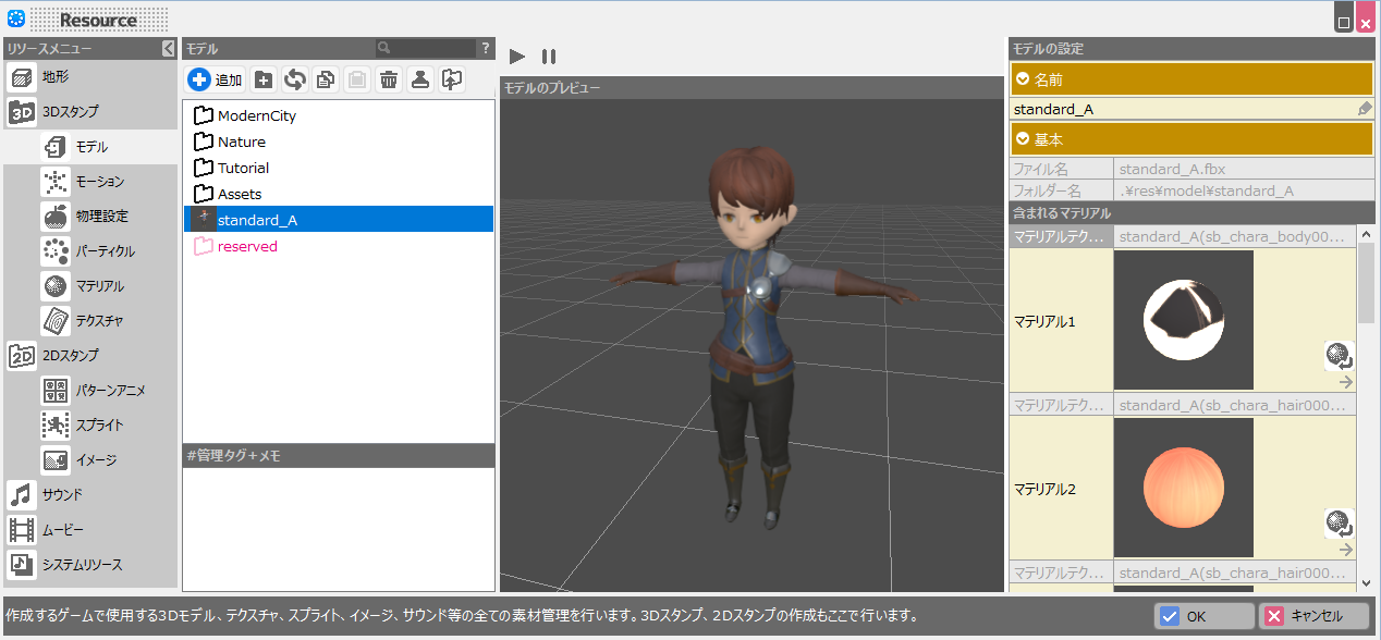 ここでは、3D_Tutorialゲームファイルの「Standard_A」キャラクターモデルを参考に説明していきます。