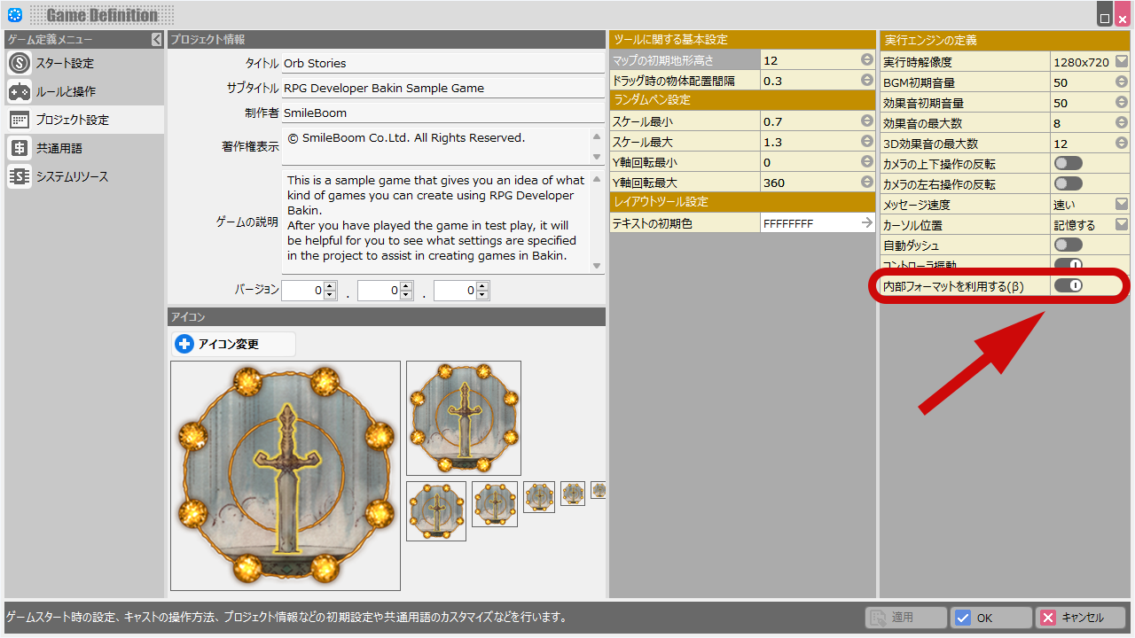 ゲーム定義>プロジェクト設定 から有効・無効を切り替えることが出来ます。
