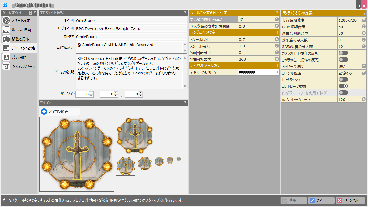 ゲームのタイトルやアイコン、ゲーム実行時の解像度、BGM音量の初期設定などを設定します。