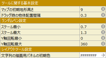 ランダムペンの設定や初期マップの高さなどを設定できます。