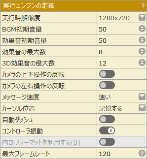 ゲーム実行時の解像度などを設定できます。