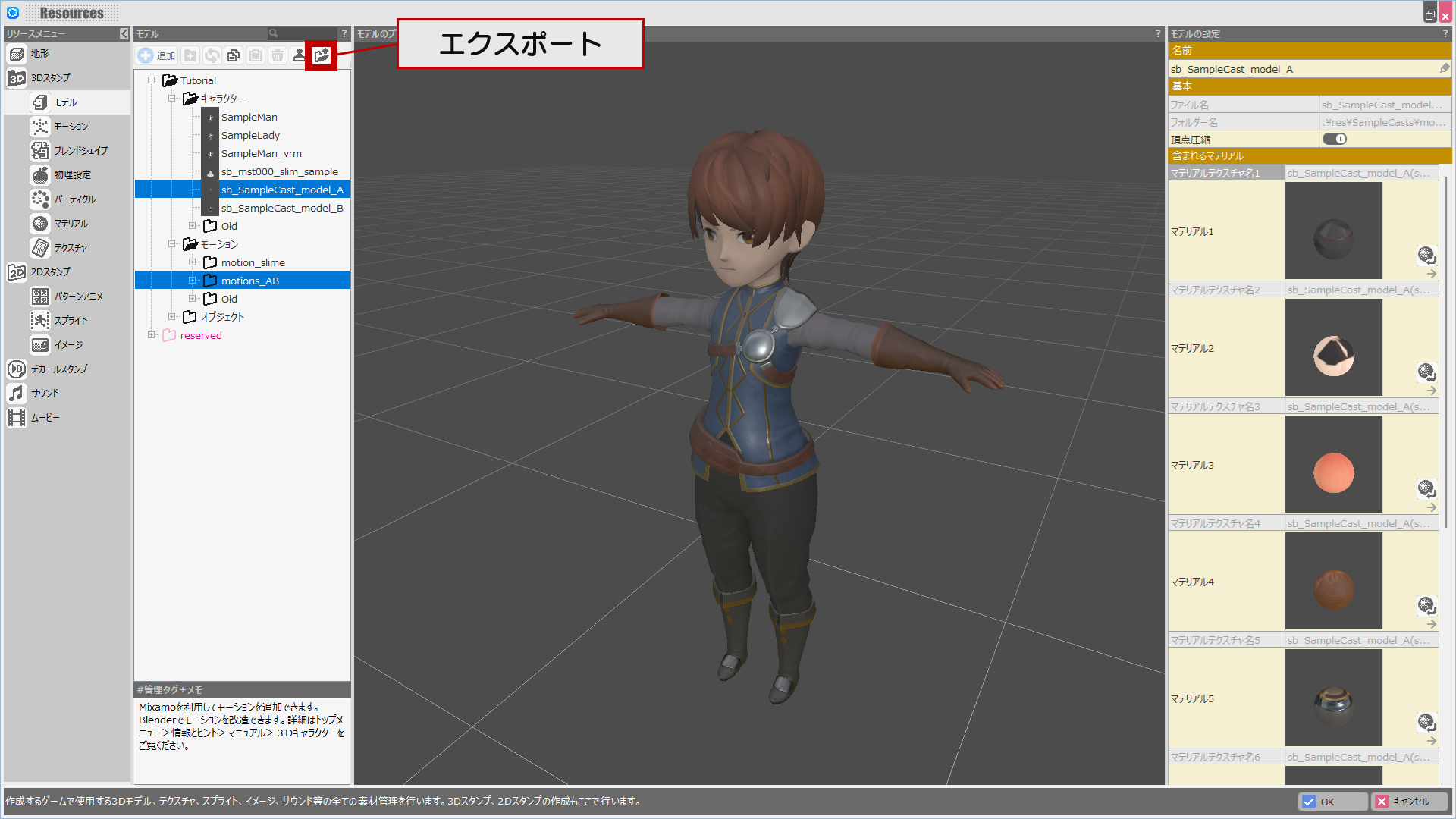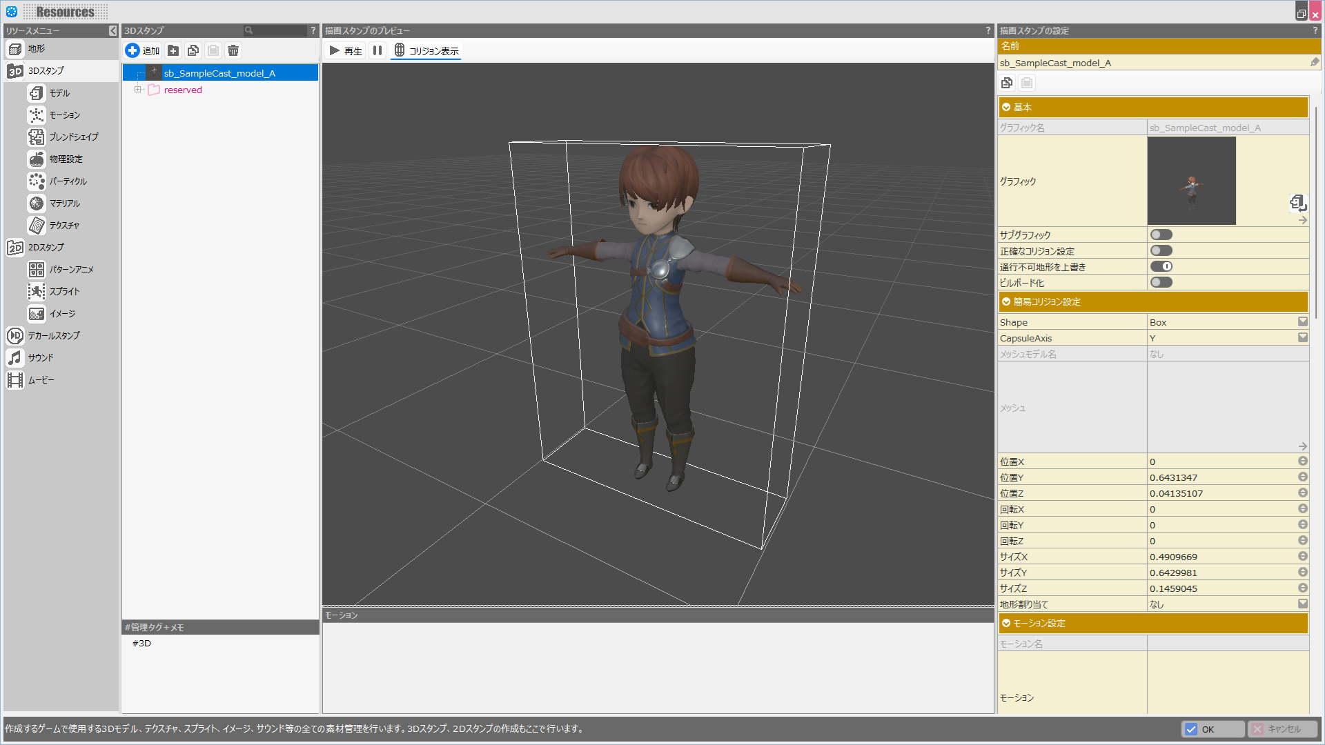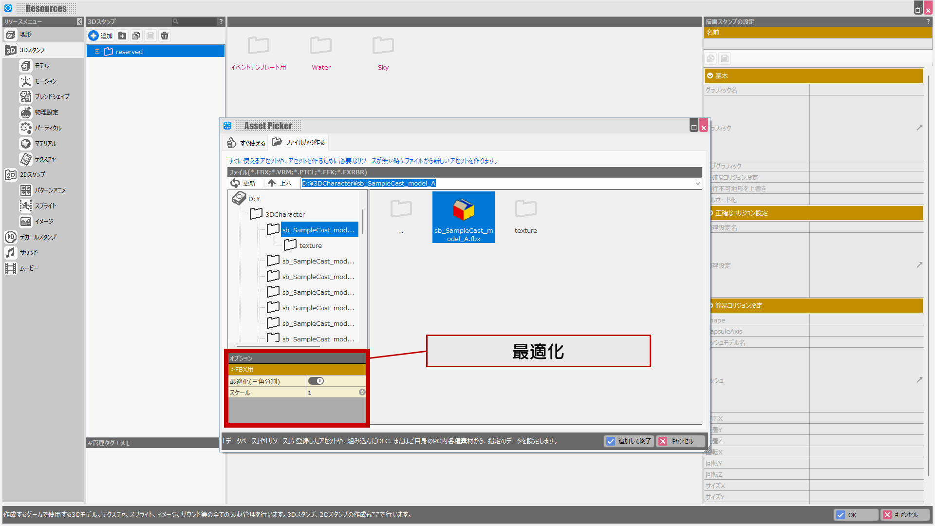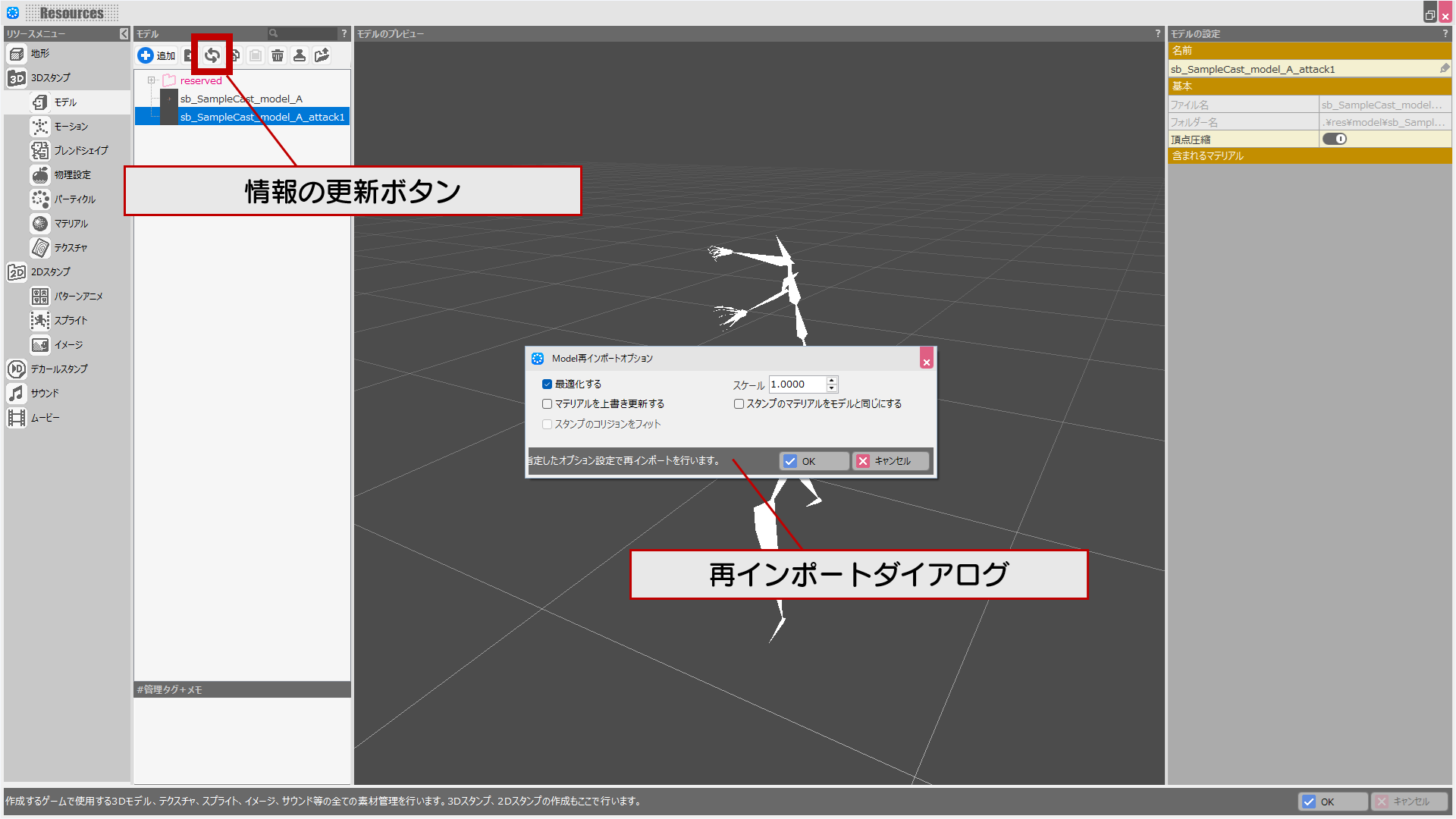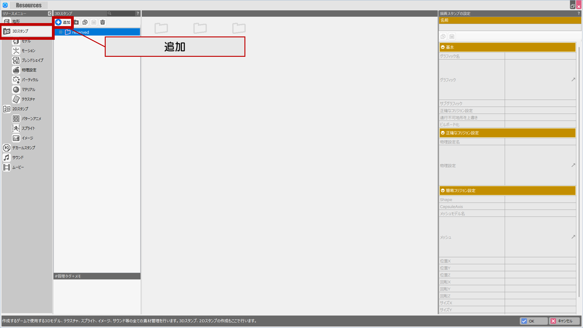 リソース>モデルからもインポートすることができますが、モデルをマップに配置したり、ゲームで使えるようにするためには「スタンプ」にする必要があります。