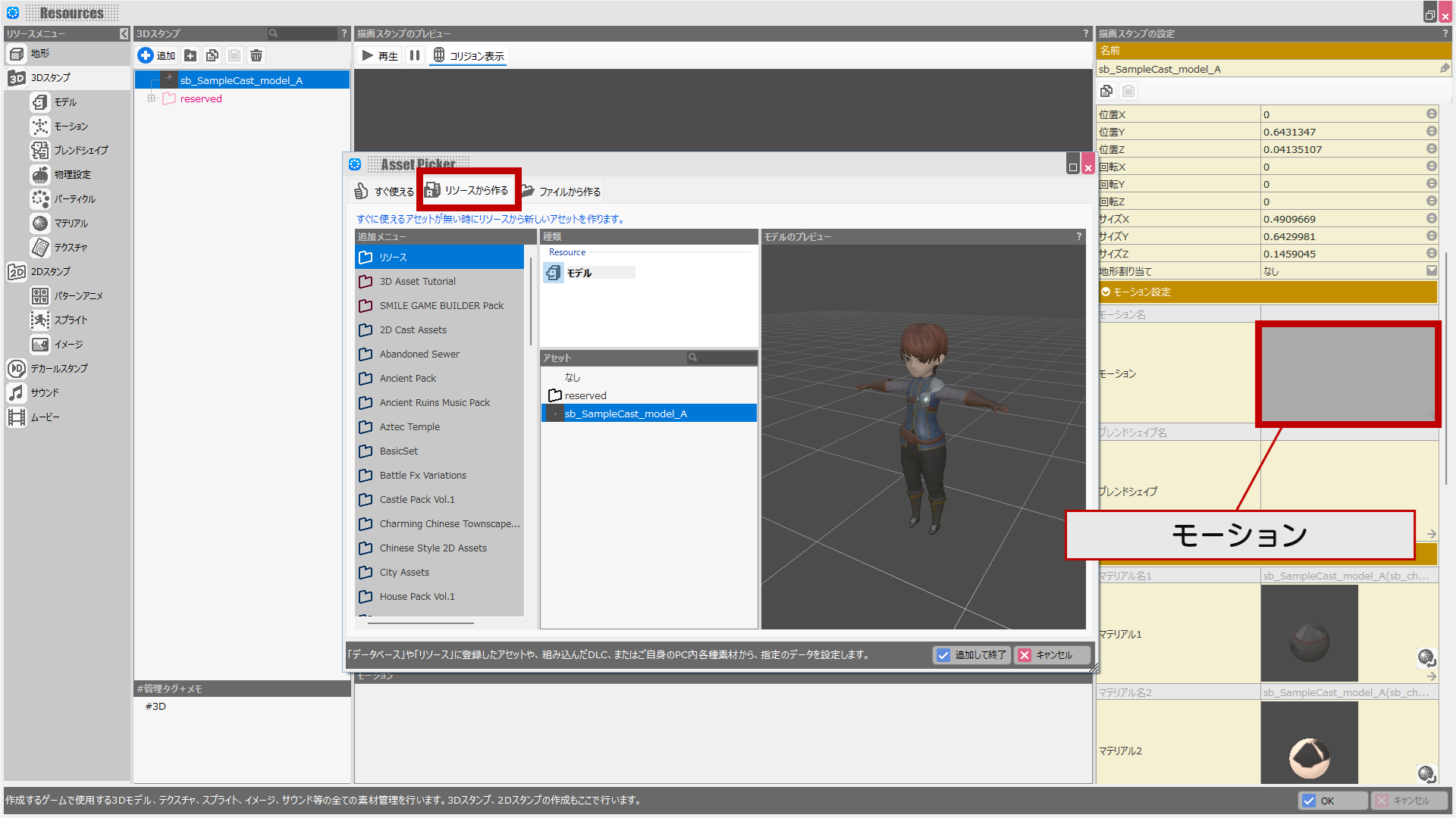 - リソース>3Dスタンプ>スタンプの設定>モーション設定>モーション欄をクリック。