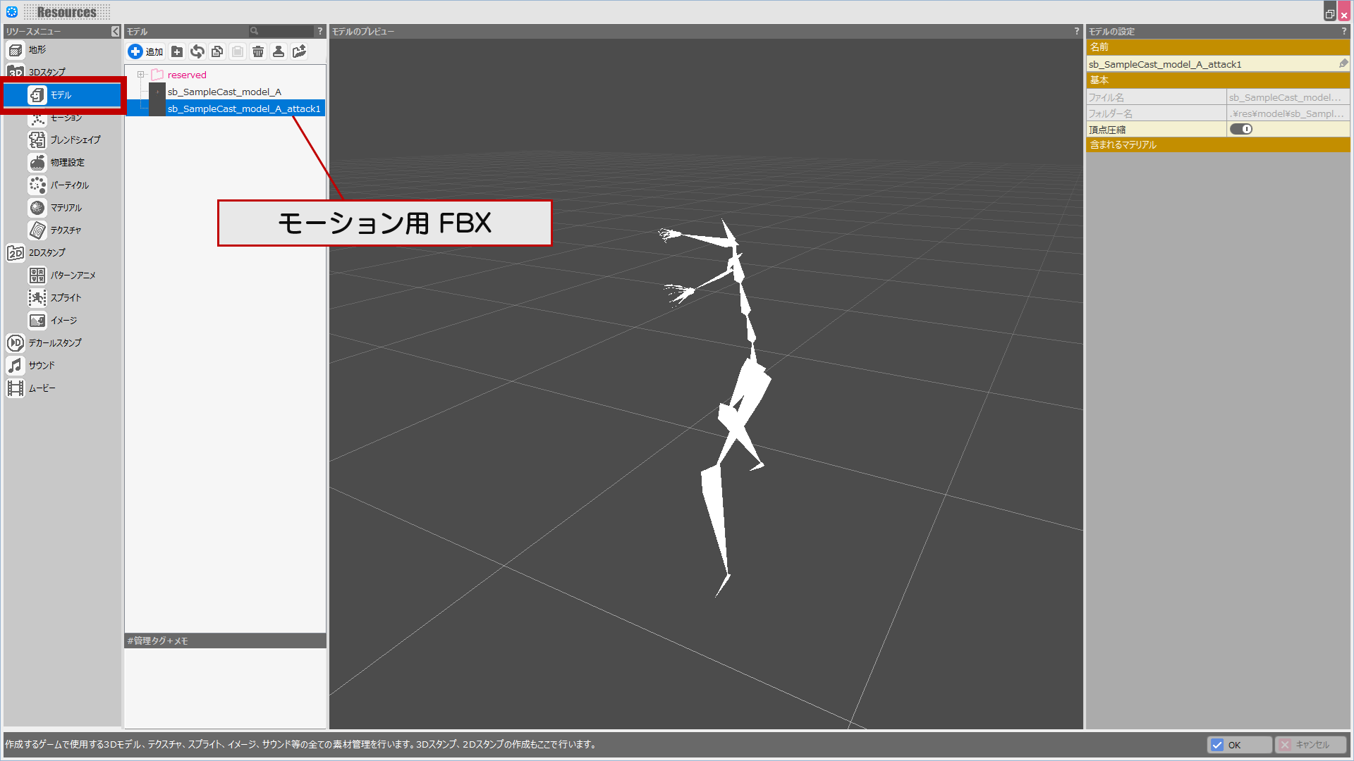 (!)追加されたモーションFBXは、リソース>モデルに登録されます。