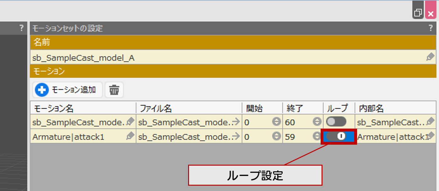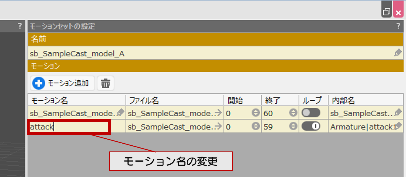 10. モーションリストに追加されたデータの「モーション名」を適宜変更し、ループをするか否かを設定する。