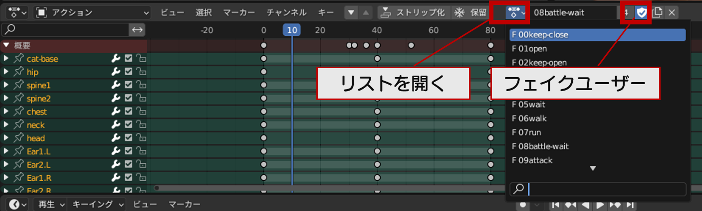 - Blender上でデータを作成する際の方法:Blenderでドーブシート>アクションにて新規で各モーションを追加し、フェイクユーザーを押した状態で作業をしてください。