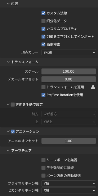 Blender を立ち上げ、ファイル>インポート>FBX を選択し、以下の設定でインポートします。