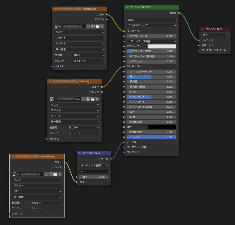 Blender上で下記のようにテクスチャを繋げると、Bakinにインポートした際に自動的に「a_n_rm」のシェーダーが作られ「アルベド・ノーマル・マスク」が割り当たります。