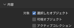 - モーションデータ: スケルトン構造+モーションデータを含むデータです。エディタ上でメッシュ(ポリゴン以外)を選択した状態で、上記1.のエクスポート設定に加えて、エクスポートダイアログ内の「選択したオブジェクト」にチェックを入れて出力してください。