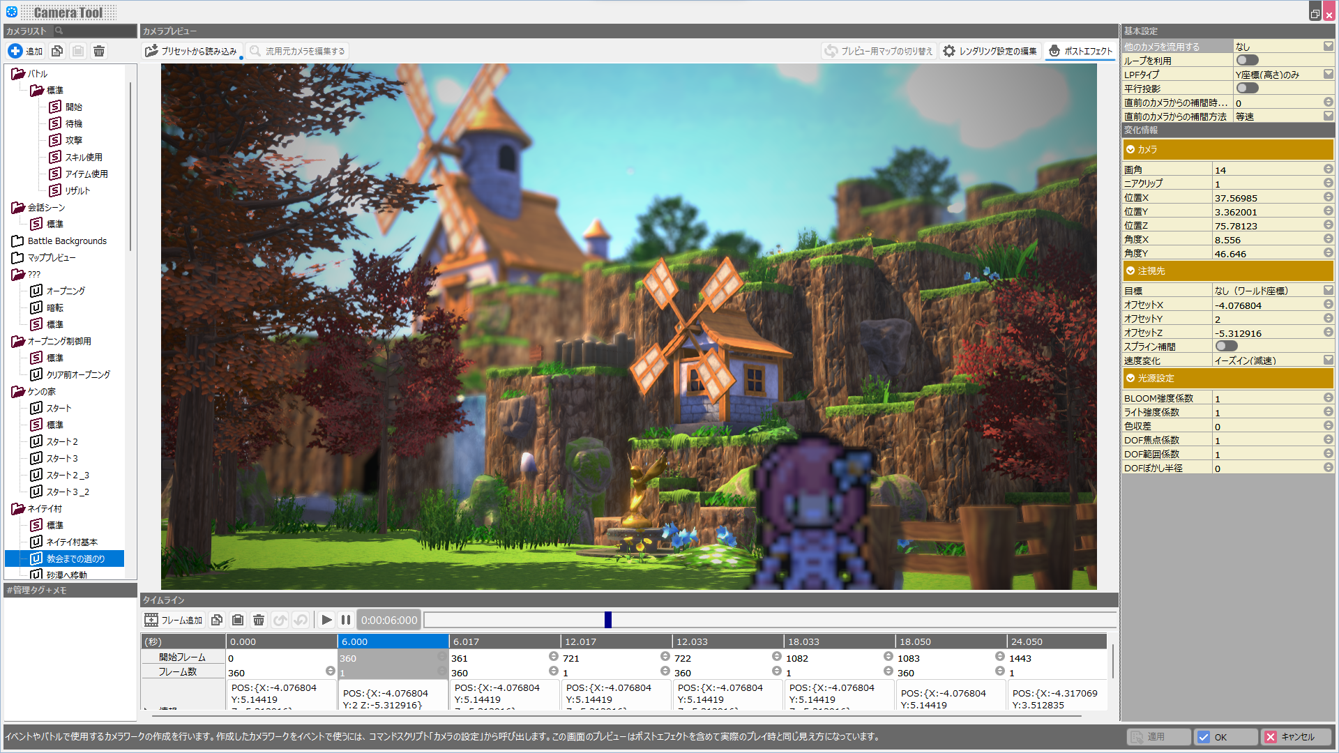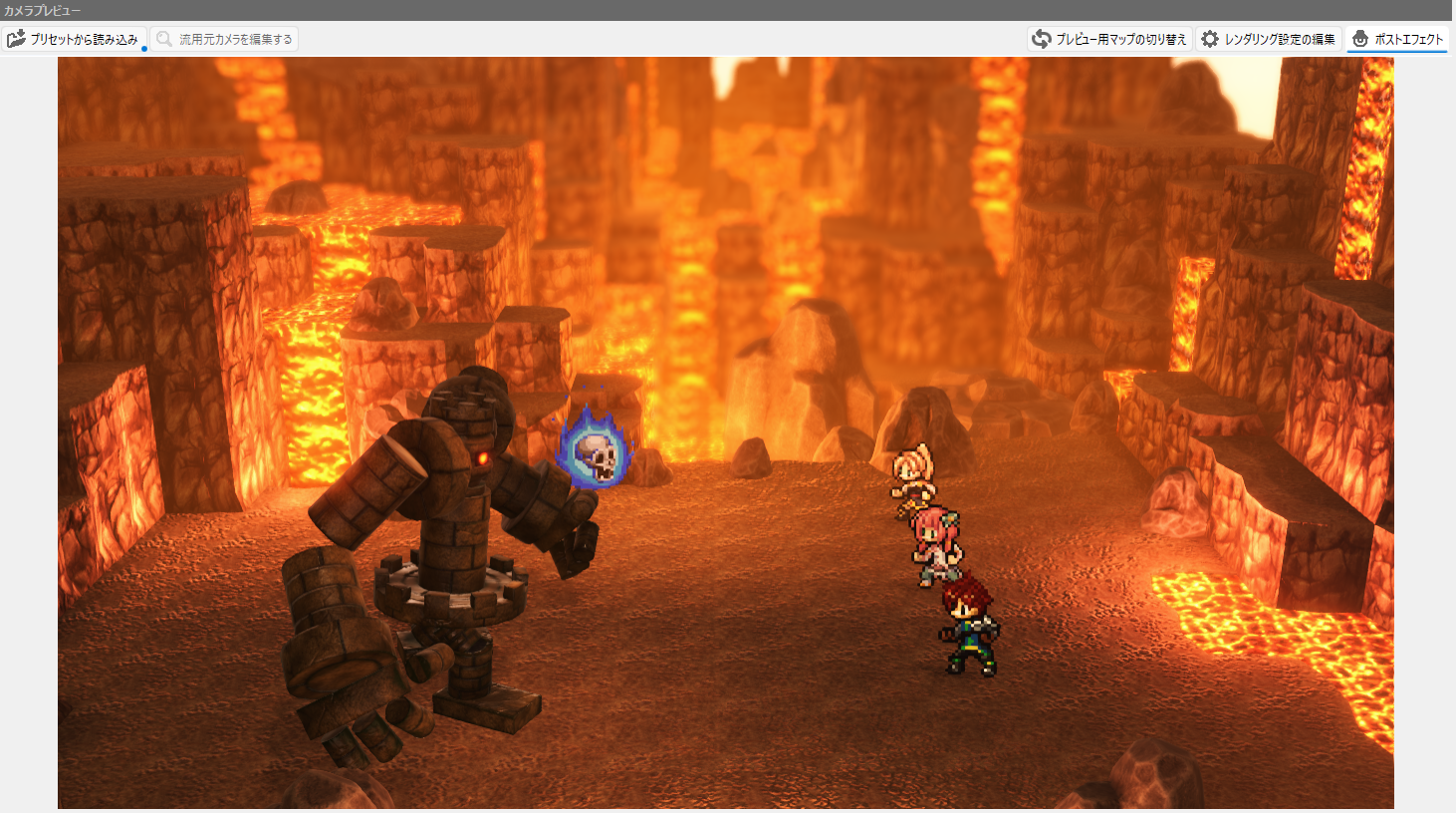 カメラツールでは、マップ移動中のカメラ、イベントやバトル、会話シーンのカメラ演出を作成できます。