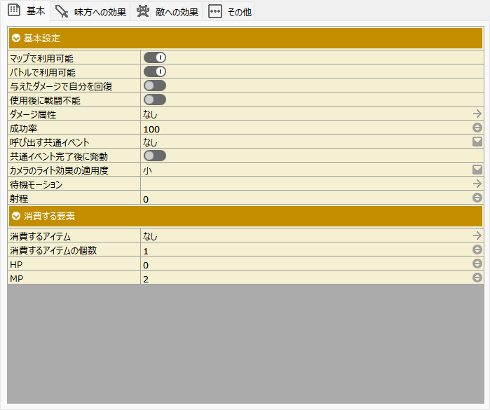 ゲーム内でキャストが使用する魔法や特技などをスキルと呼びます。ここでは、各種スキルの登録やデータ作成を行います。キャストの能力が変化するものや攻撃を行えるものなど、様々なスキルを設定できます。