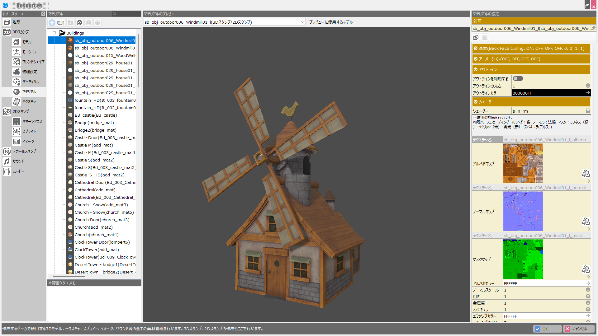 リソースメニューのマテリアルでは、マテリアルの詳細設定を行います。
