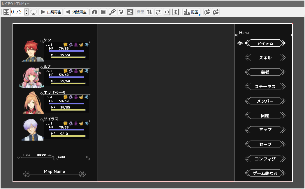 さまざまなゲーム画面やメニュー、シーンごとにデザインや演出を施すことができるのがレイアウト機能です。
