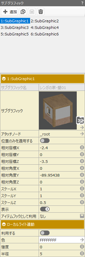 ローカルライト(ポイントライト)をサブグラフィックとして付ける際の設定です。
