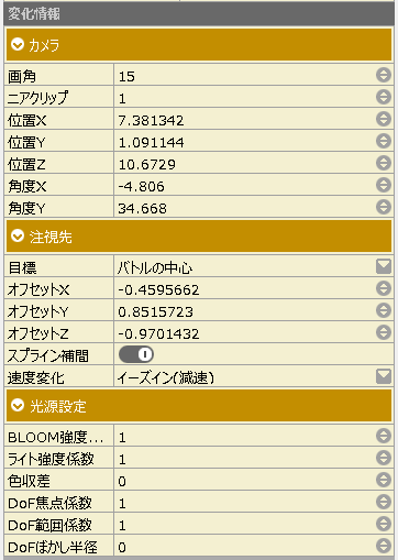カメラツール右側の「変化情報」で設定した値が入ります。