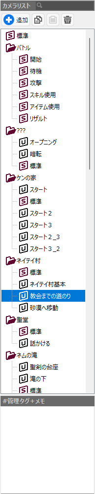 リストの「会話シーン」フォルダ、もしくは「会話シーン」フォルダ内のカメラを選択した状態で「追加」ボタンを押すとカメラを新規に追加することができます。