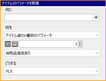 指定のアイテムのパラメータを取得し、変数に指定の方法で代入します。