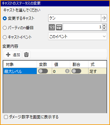チェックを入れるとイベントが実行されたとき、ダメージ数字が画面に表示されます。