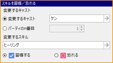 スキルを習得/忘れるを実行するキャストの指定を行います。パーティ全体を対象にすることも出来ます。