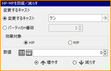 HP/MPを回復または減らすキャストを選択します。パーティ全体を対象にすることも出来ます。