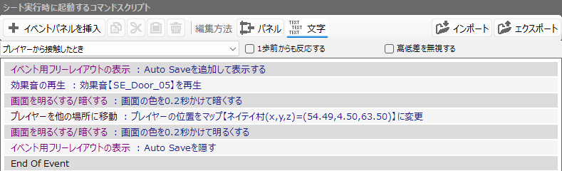 マップ間移動を伴わない重要なイベントの最後にこのパネルを使ってオートセーブする、といった使い方ができます。