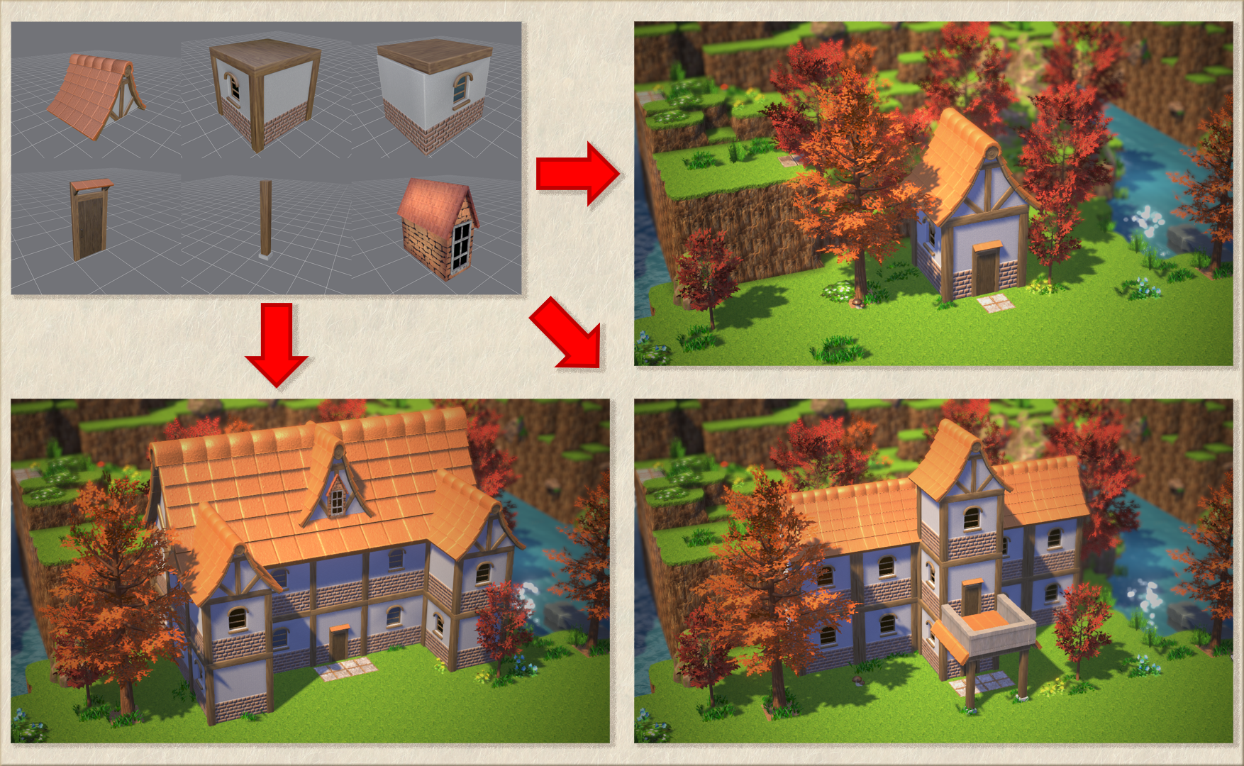 この機能を使うことで、屋根・壁・窓といったパーツごとのスタンプを組み合わせて様々な形の家を作ったり、ランプに明かりを組み合わせて明かりのついたランプを作ったりすることができます。