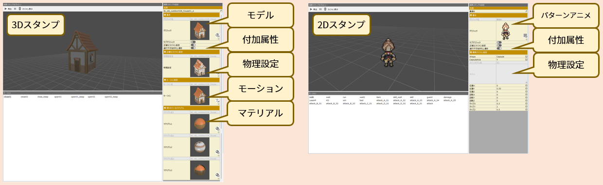 「スタンプ」とは、モデル、モーション、マテリアルなどの素材をゲーム内で使用するために一つに組み合わせたものです。