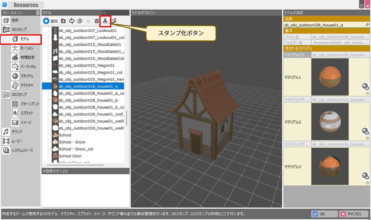 ツリー欄の上にある、「スタンプ化ボタン」を押すことで「3Dスタンプ」となり、マップエディターのスタンプパレットに登録されるようになります。