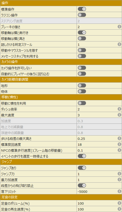 プレイヤーやイベントがジャンプしたり落下したりするさいの重力加速度を設定します。
