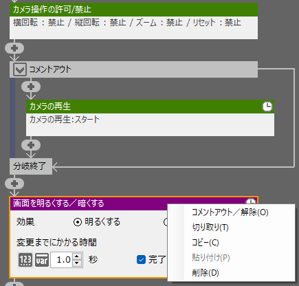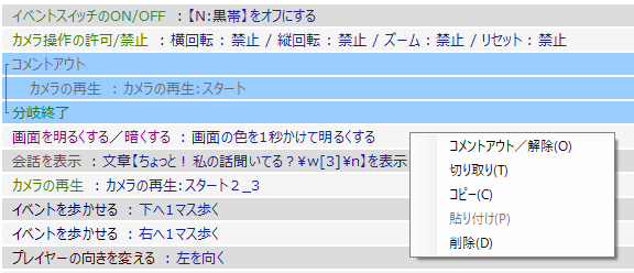 イベントパネルのコピー/切り取り/削除やコメントアウトができます。