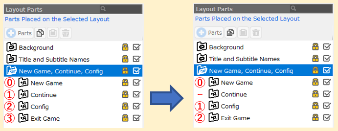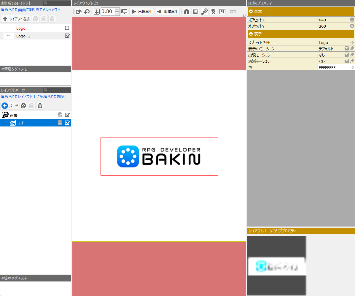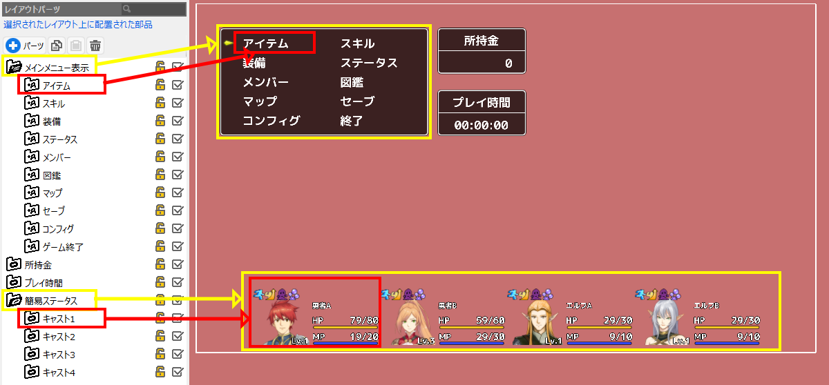 それぞれのパーツがどのように使われるかは、デフォルトのレイアウトデータや、サンプルゲームOrb Storiesのレイアウトデータを参考にするとよいでしょう。