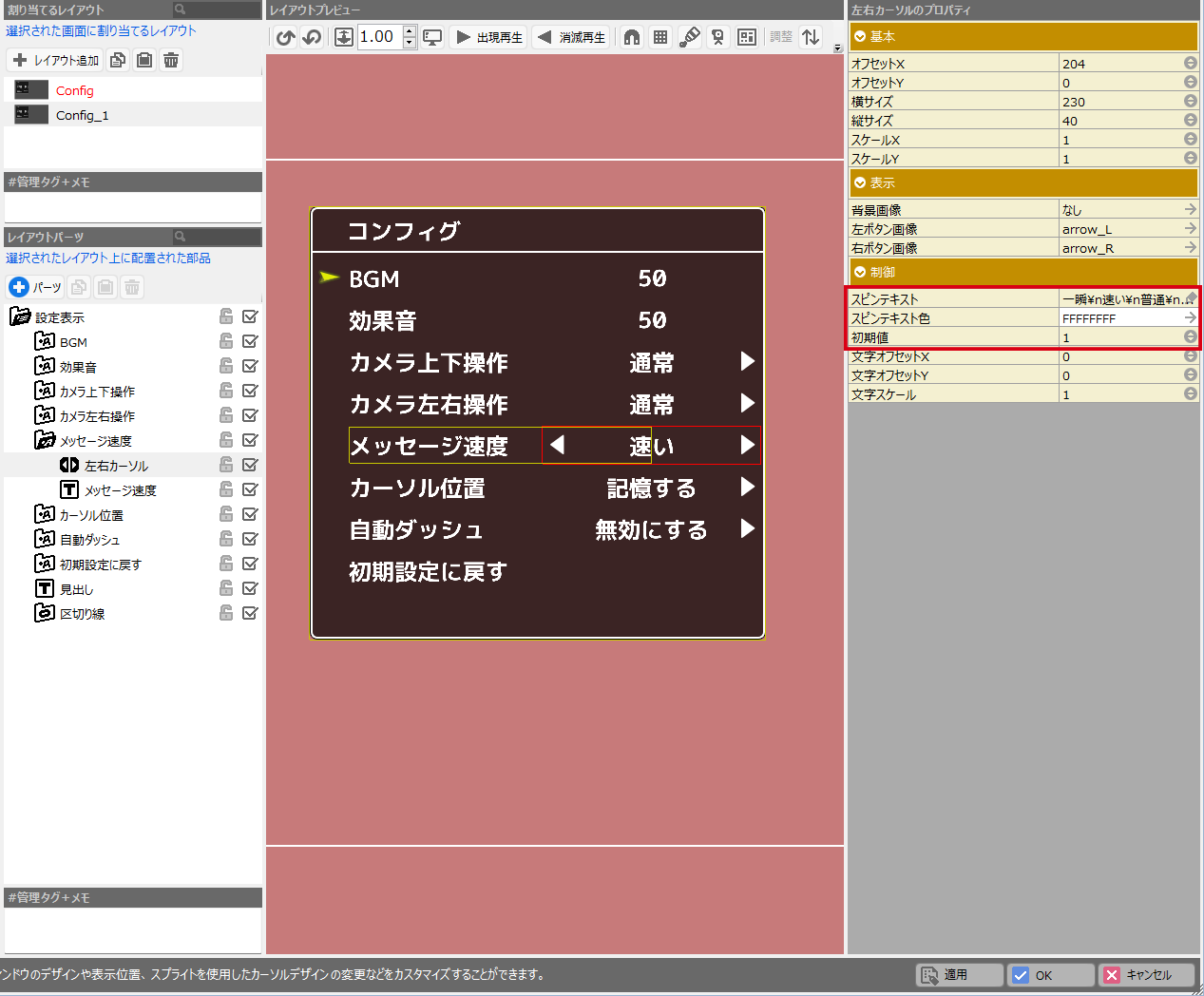 | スピンパネル | 左右の入力操作で、テキスト項目を選択できる仕組みを提供するパネルです。「早い/普通/遅い」を左右キーで切り替えて選択するようなシーンで使います。 親となるコンテナが指定する特定のアクションに対して使用することができます。 現状は「コンフィグ」画面でのみ効力を発揮します。 |